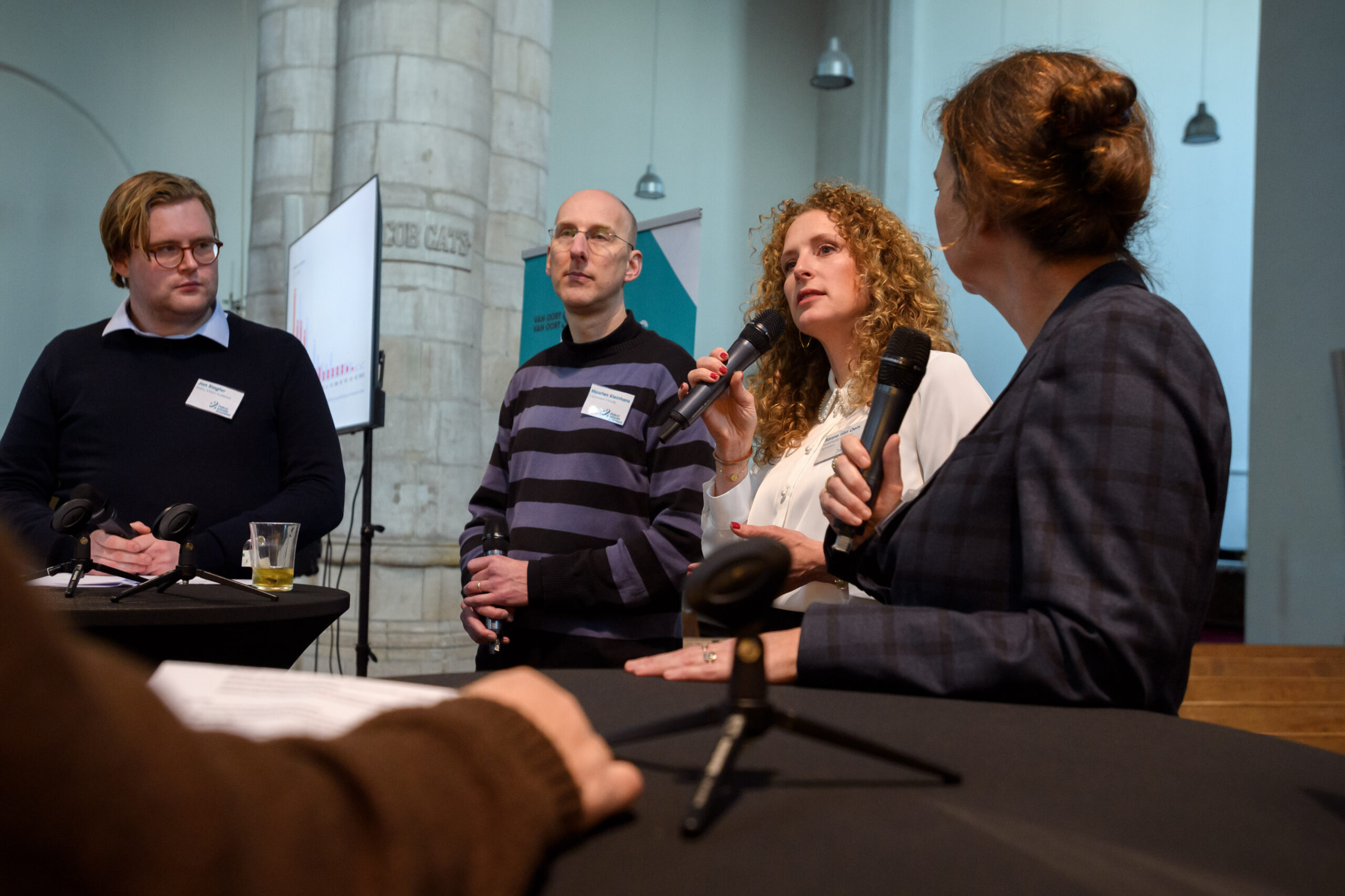 Na deze inleiding begon het eerste panel van sprekers, bestaande uit Sandra Molenaar (directeur Consumentenbond), Maarten Kleinhans (hoogleraar Universiteit Utrecht) en Sanne van Oers (lid Algemene Raad van de Nederlandse Orde van Advocaten (NOvA)). Van Oers trapte af door te wijzen op de rechtstatelijke doorlichting van de verkiezingsprogramma’s die NOvA heeft uitgevoerd. Verschillende partijen die een goede verkiezingsuitslag hebben behaald, kwamen er in deze doorlichting niet goed van af. Het gaat dan vooral om zaken als het waarborgen van fundamentele rechten en vrijheden van alle burgers. Kleinhans deelde heel andere zorgen. Als expert op het gebied van bodemdaling gaf hij aan dat inefficiënt of ontbrekend klimaatbeleid de kans op overstromingen in Nederland erg verhoogd. Aangezien veel huizen juist de sociale huursector nu worden gebouwd in laaggelegen en andere risicogebieden, wees hij tevens op de sociale ongelijkheid dat door dit beleid kan worden vergroot.